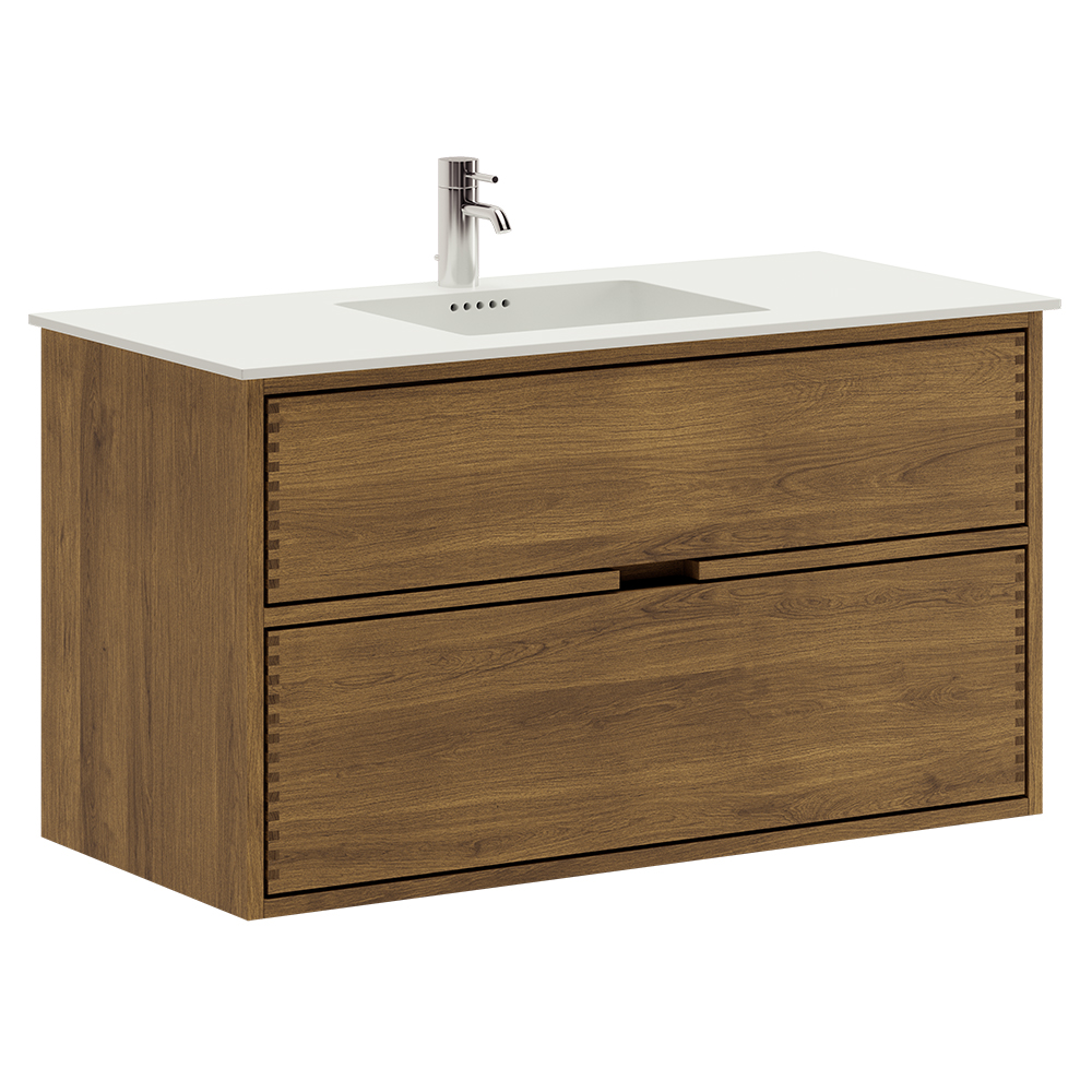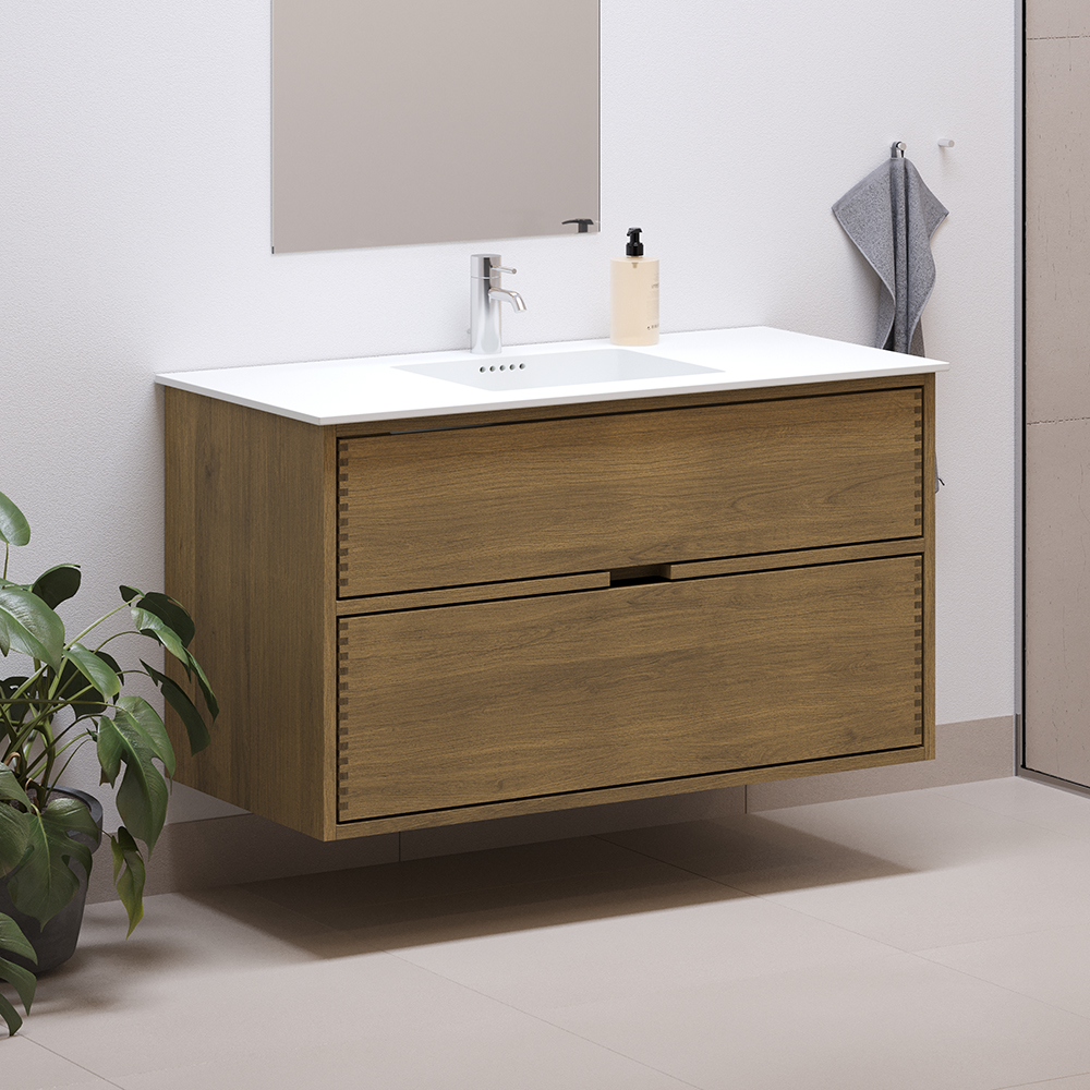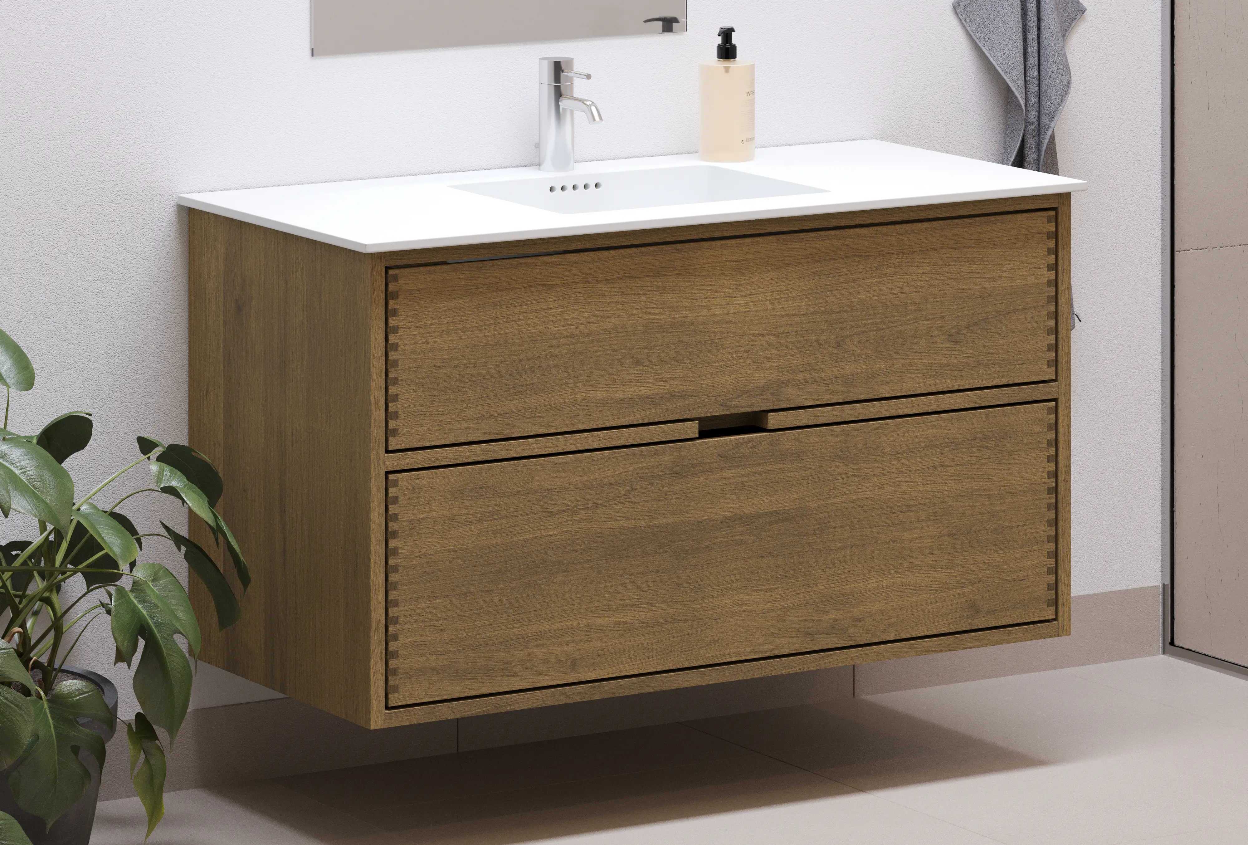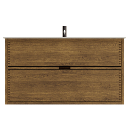 Dit timmerman badmeubel heeft 2 laden. Het meubel is gemaakt met massieve, geoliede en vingergetapte houten laden van eikenhout met mooie details. De laden zijn gemaakt met volledige uittrek en softclose en worden geleverd met een wastafeluitsparing in de bovenste lade en volledige diepte in de onderste lade.