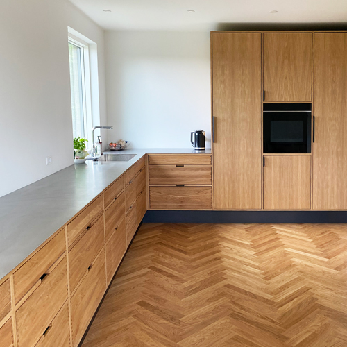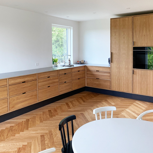 Bij onze Just Wood Snedkerkøkken serie wordt de keukenkast geproduceerd met een middenstijl en een gat in het midden om de lades uit te trekken.