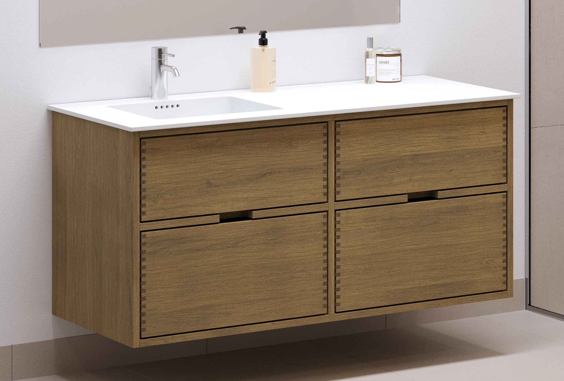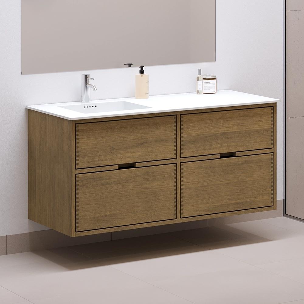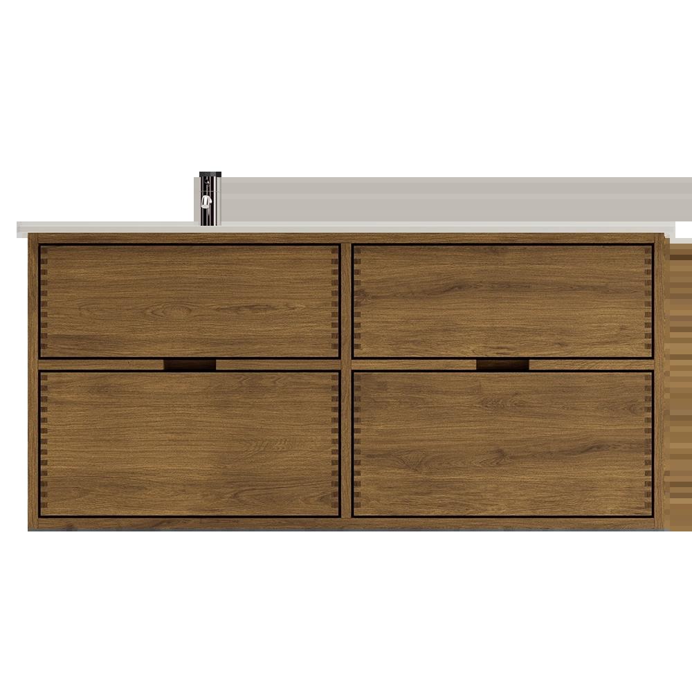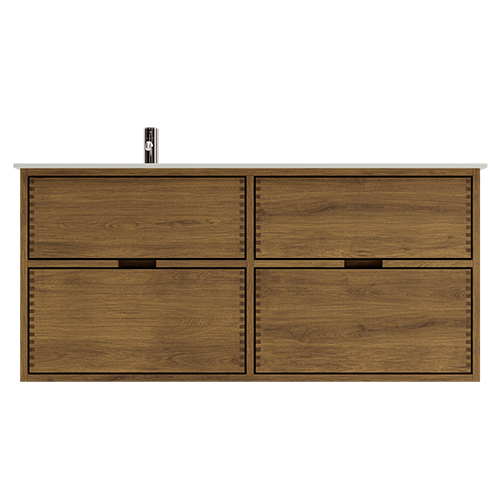 Dit timmerman badmeubel heeft 4 laden. Het meubel is gemaakt met massieve, geoliede en vingergetapte houten laden van eikenhout met mooie details. De laden zijn gemaakt met volledige uittrek en softclose en worden geleverd met een wastafeluitsparing in de bovenste lade en volledige diepte in de onderste lade.