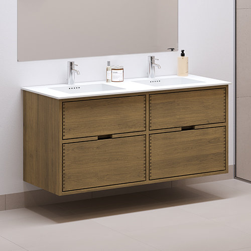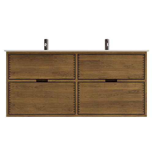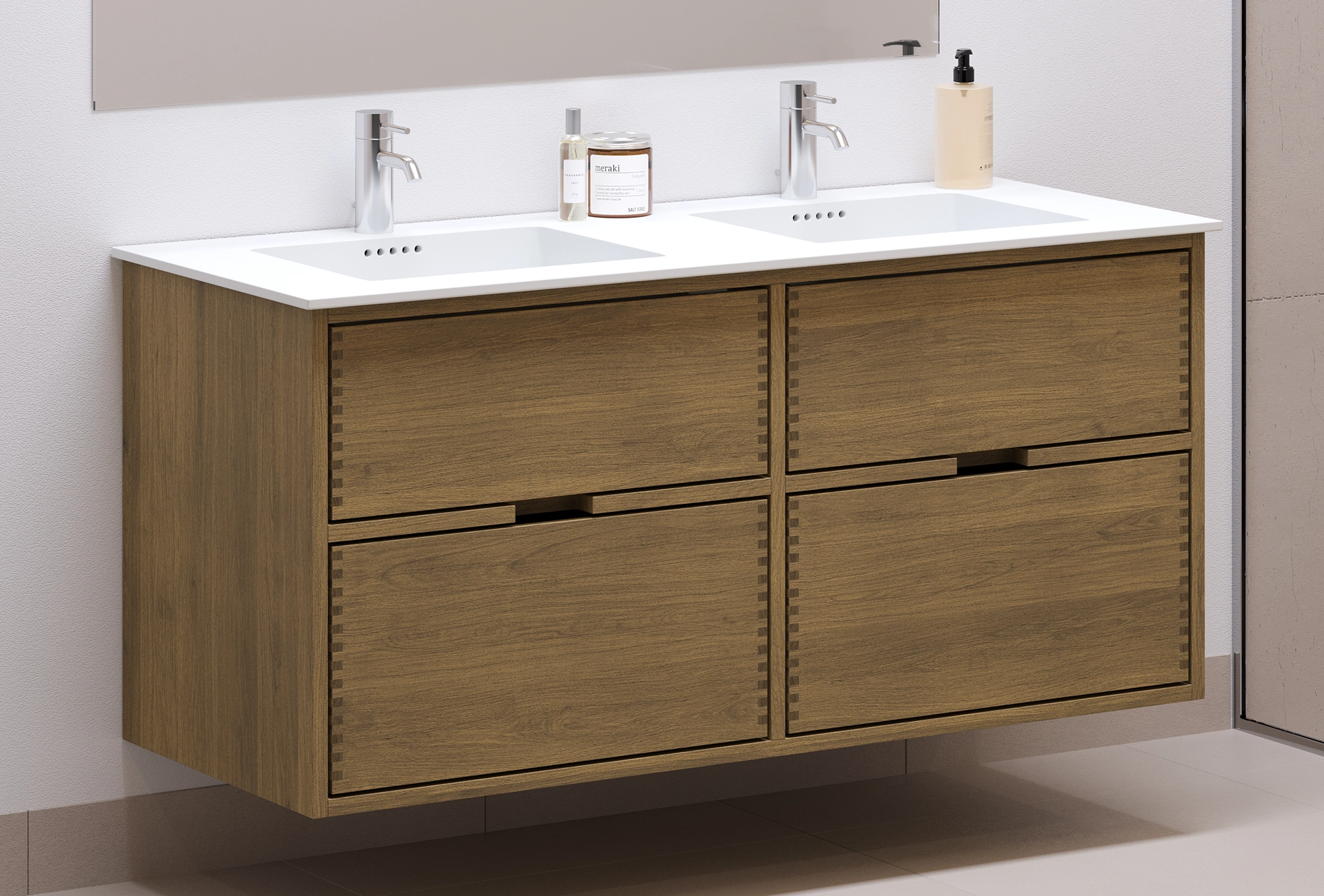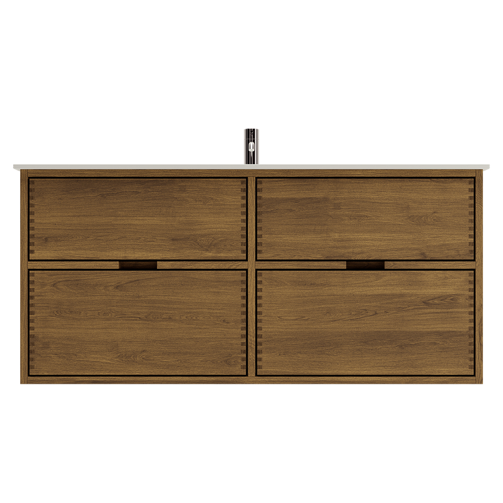 Dit meubelstuk heeft 4 laden. Het meubel is gemaakt met massieve, geoliede en vingergetapte eikenhouten laden met mooie details. De laden hebben volledige uittrek en softclose en hebben een wastafeluitsparing in de bovenste lade en volledige diepte in de onderste lade.