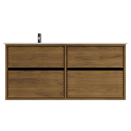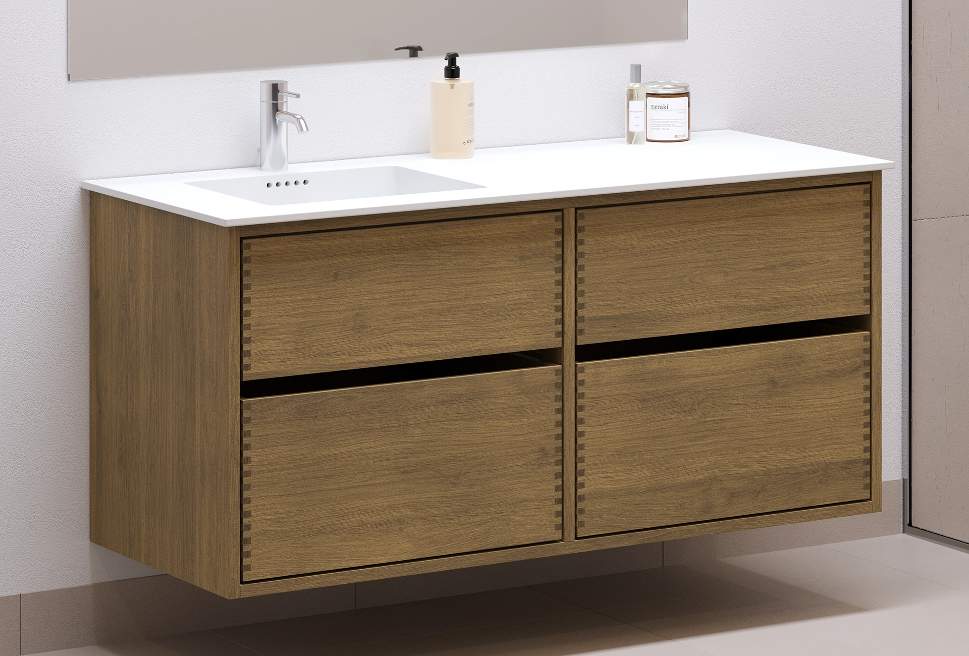 In deze serie wordt het badmeubel gemaakt van donker geolied hout, zonder tussenstuk en met ruimte tussen de laden.