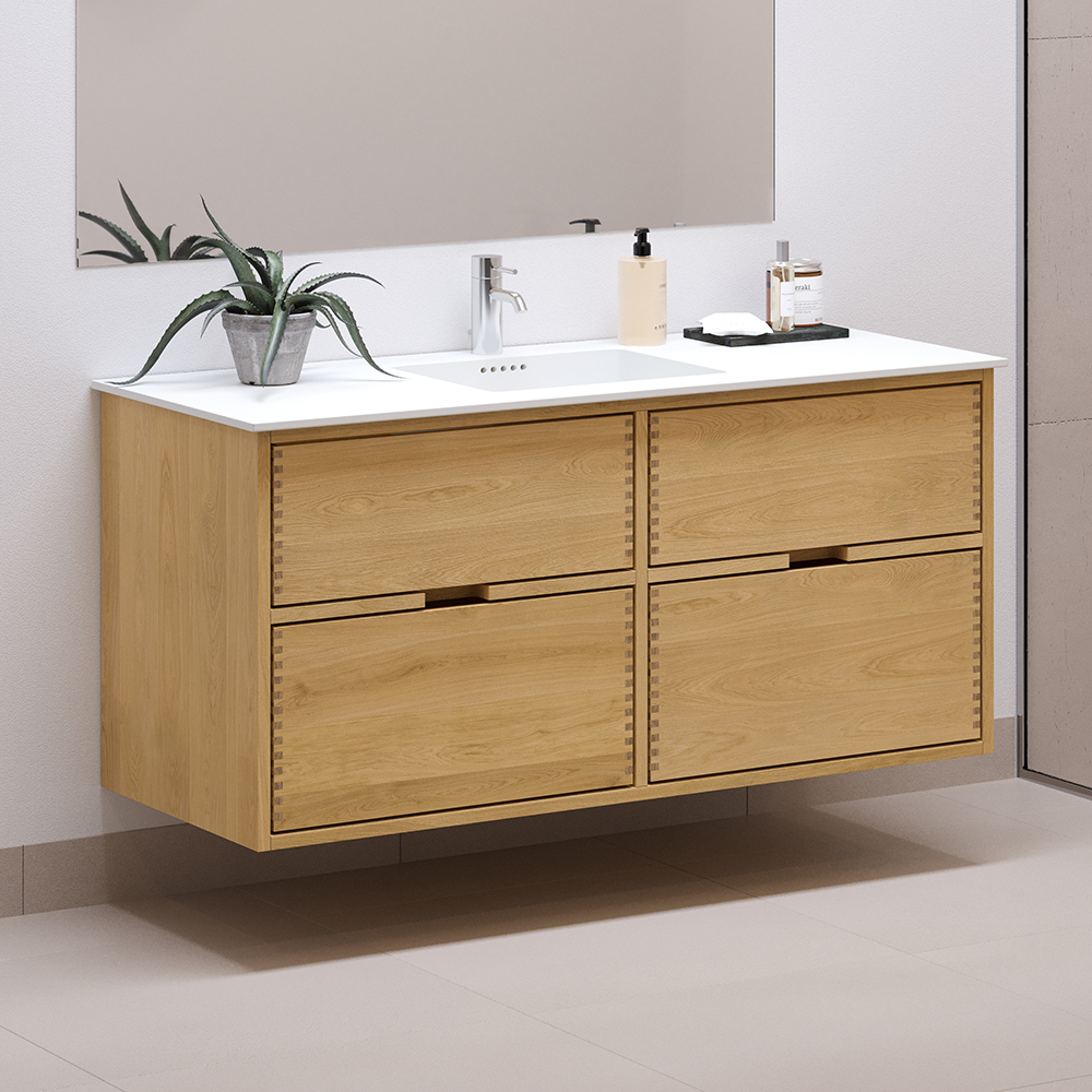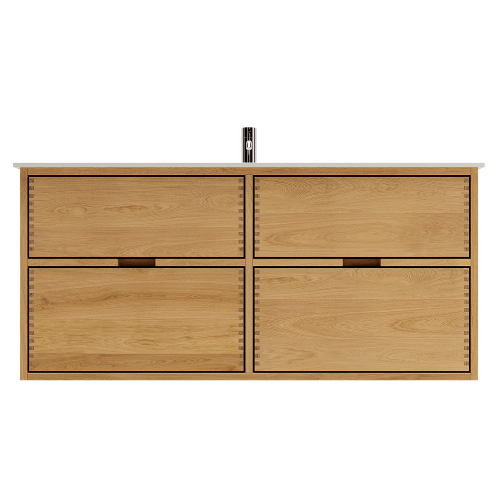 Dit timmerman badkamermeubel heeft 4 laden. Het meubel is gemaakt met massieve, geoliede en vingergetapte houten laden van eikenhout met mooie details. De laden zijn gemaakt met volledige uittrek en softclose en worden geleverd met een wastafeluitsparing in de bovenste lade en volledige diepte in de onderste lade.