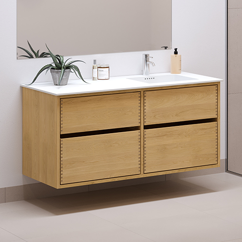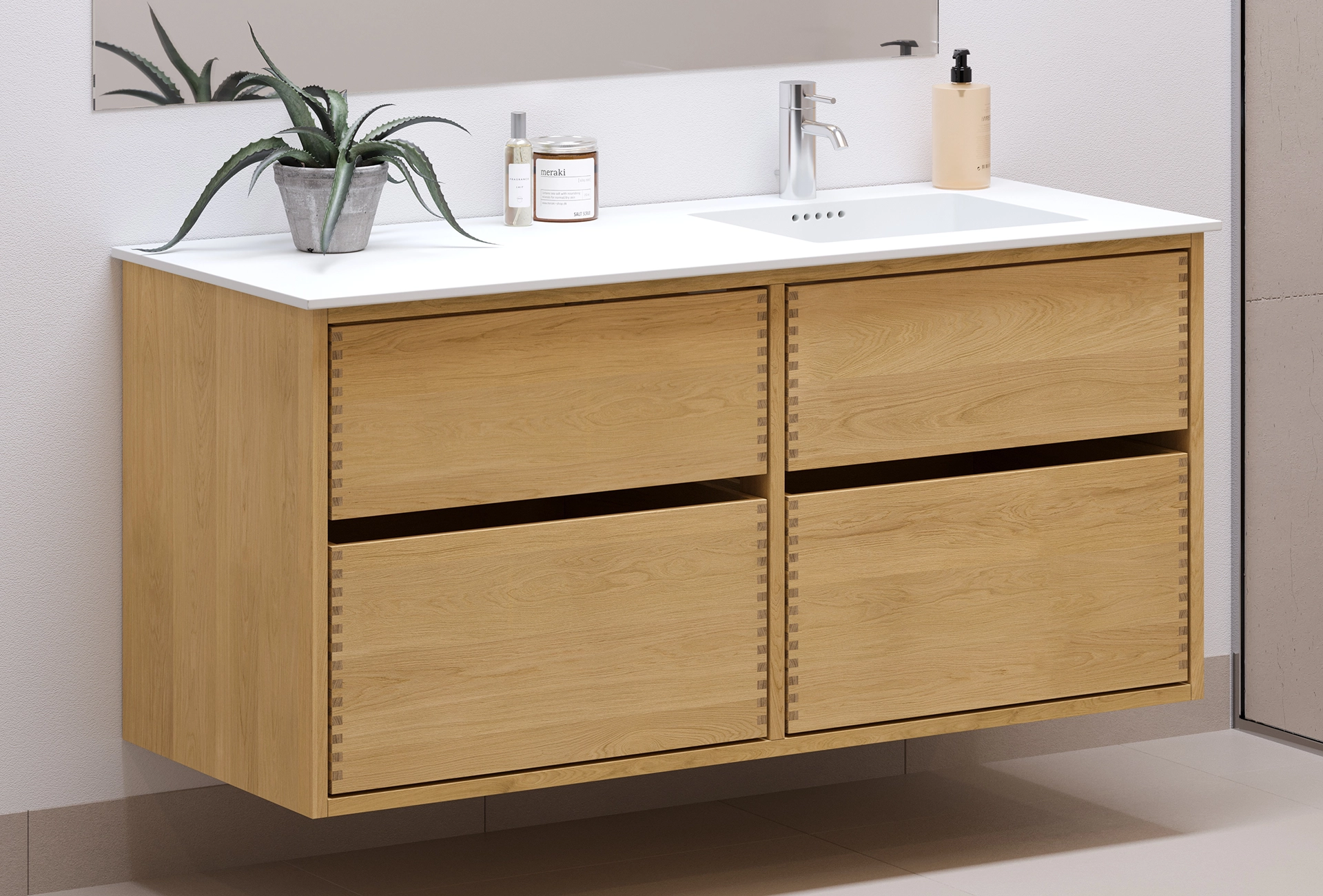 Deze meubelmakerij badmeubel heeft 4 laden. Het meubel is gemaakt met massieve, geoliede en vingergetapte houten laden van eikenhout met mooie details. De laden hebben volledige uittrek en softclose en worden geleverd met een wastafeluitsparing in een lade en volledige diepte in de rest van de laden.