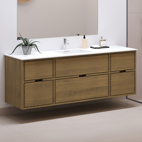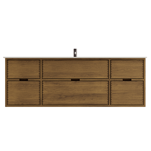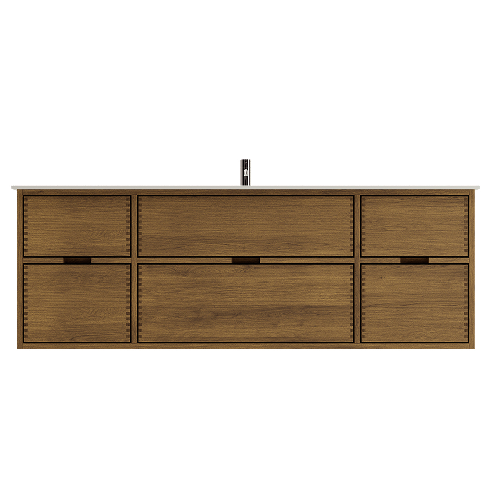 Dit meubelstuk van een timmerman heeft 6 laden. Het meubelstuk is gemaakt met massieve, geoliede en vingergetapte eikenhouten laden met mooie details. De laden zijn gemaakt met volledige uittrek en softclose en worden geleverd met een wastafeluitsparing in de bovenste lade en volledige diepte in de onderste lade.