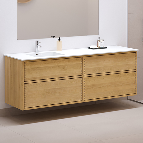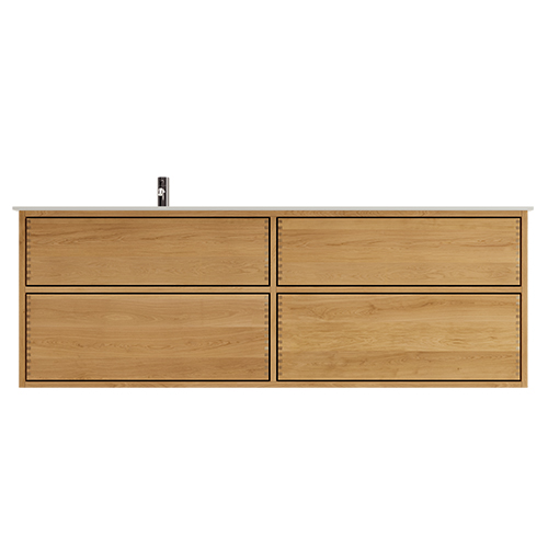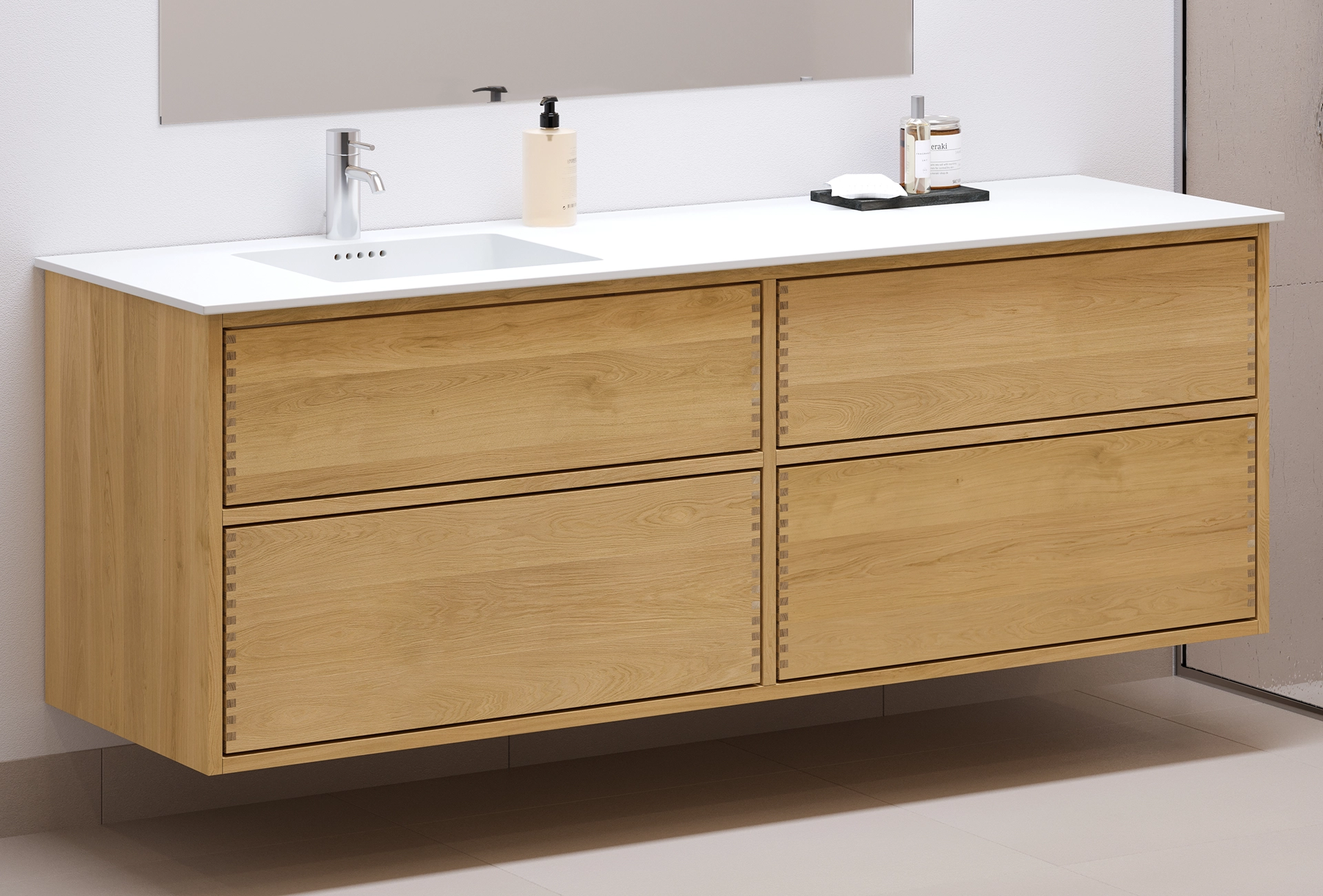Dit meubelmakerij badkamermeubel heeft 4 laden met push to open. Het meubel is gemaakt met massieve, geoliede en vingergetapte houten laden van eikenhout met mooie details. De laden zijn gemaakt met volledige uittrek en softclose en worden geleverd met een wastafeluitsparing in de bovenste lade en volledige diepte in de onderste lade.