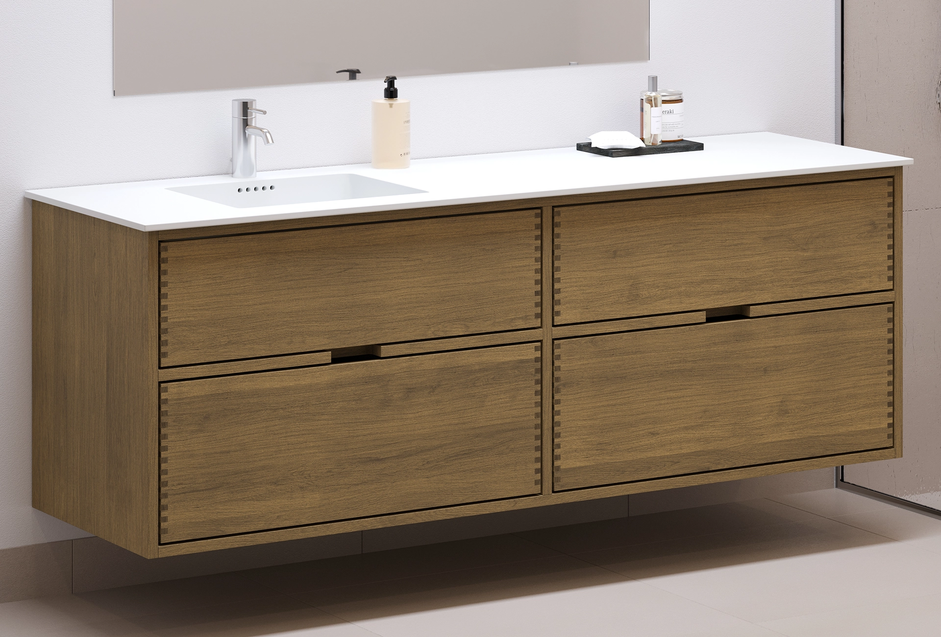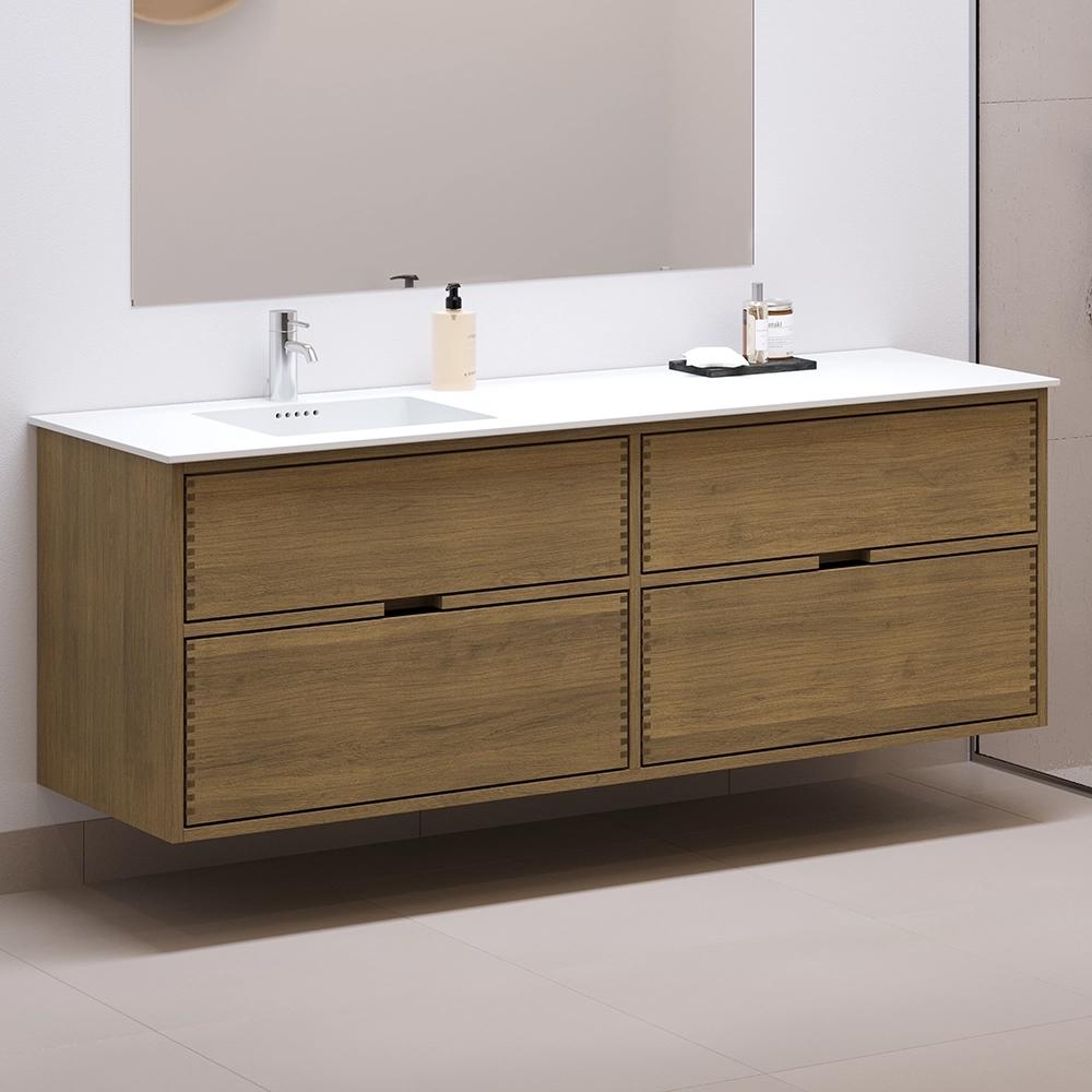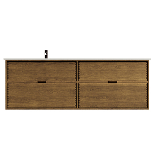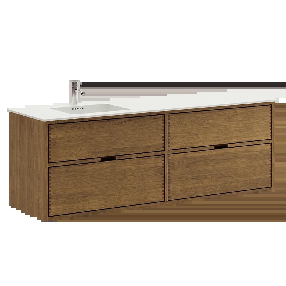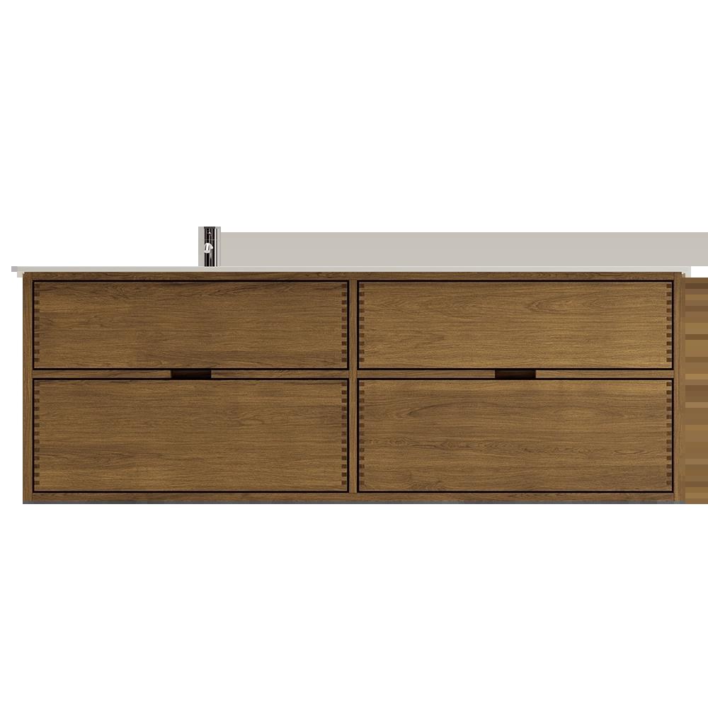 Deze meubel heeft 4 laden. De meubel is gemaakt met massieve, geoliede en vingergetapte eikenhouten laden met mooie details. De laden hebben volledige uittrek en soft-close functie en hebben een wastafeluitsparing in de bovenste lade en volledige diepte in de onderste lade.