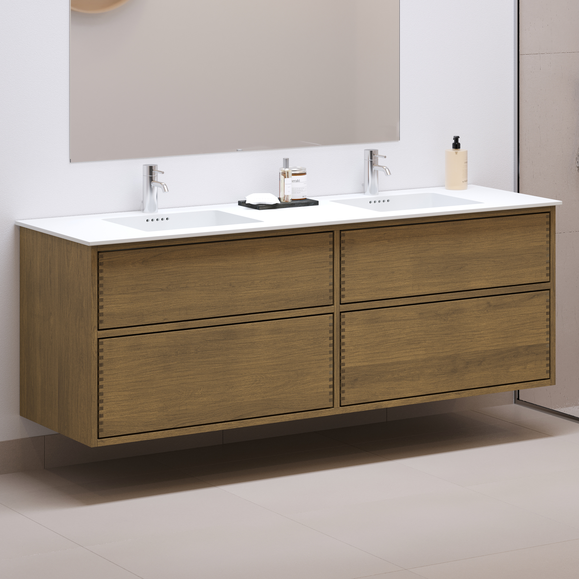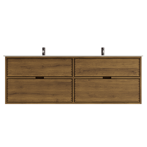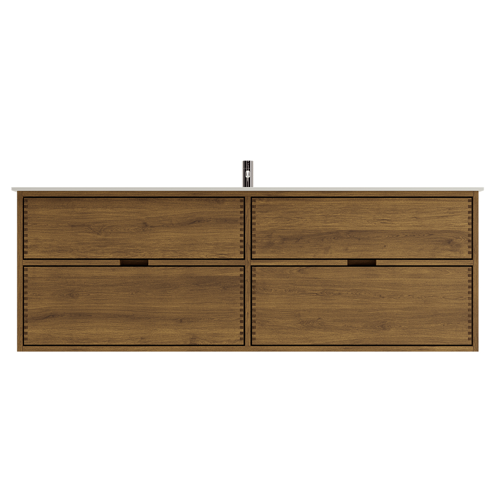 Dit meubelstuk heeft 4 laden. Het meubel is gemaakt met massieve, geoliede en vingergetapte eikenhouten laden met mooie details. De laden hebben een volledige uittrek en softclose en hebben een wastafeluitsparing in de bovenste lade en volledige diepte in de onderste lade.