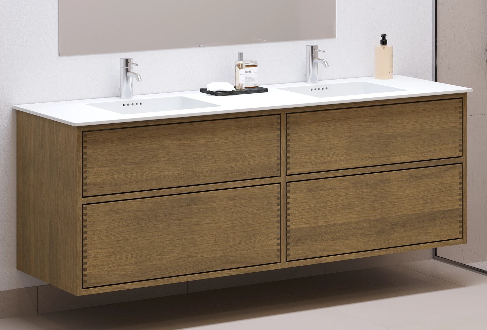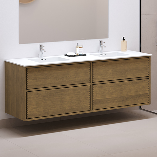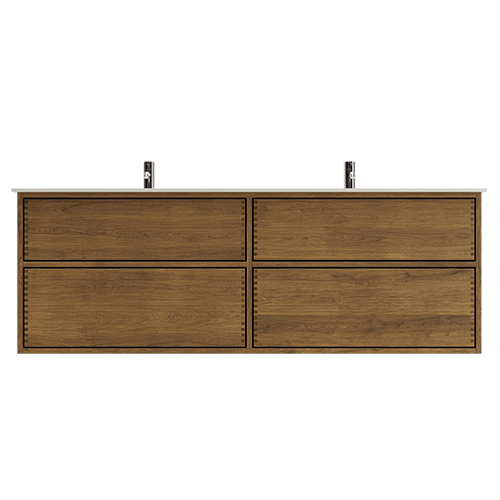 In deze serie wordt het badmeubel geproduceerd in donker geolied hout met een tussenstuk en met push to open.