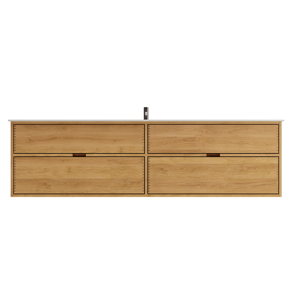 Deze timmerman badmeubel heeft 4 laden. Het meubel is gemaakt met massieve, geoliede en vingergetapte houten laden van eikenhout met mooie details. De laden hebben een volledige uittrek en softclose en hebben een wastafeluitsparing in de bovenste lade en volledige diepte in de onderste lade.