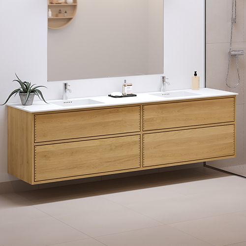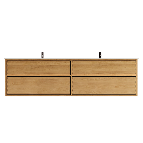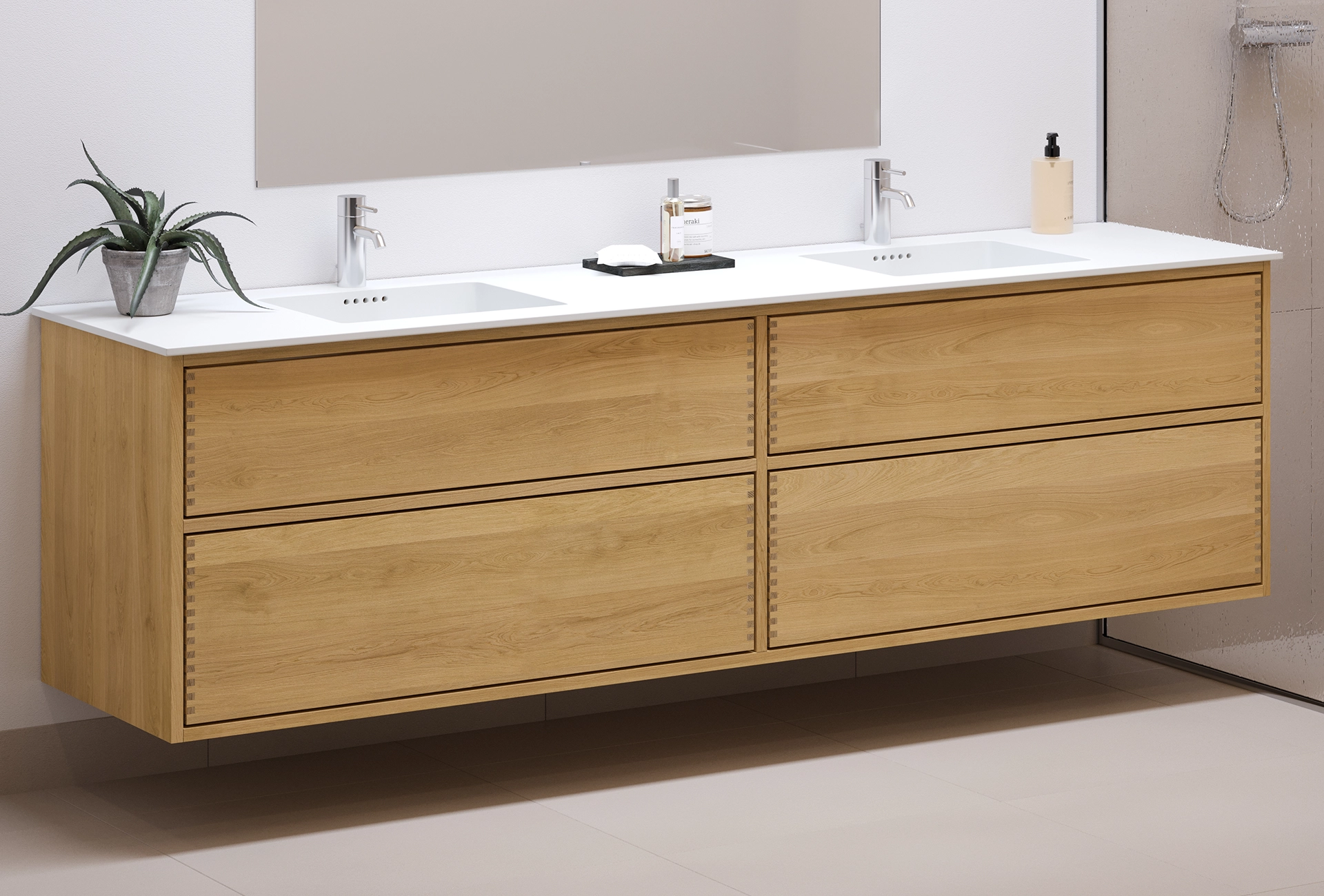 Dit meubel heeft 4 laden met push to open. Het meubel is gemaakt met massieve, geoliede en vingergetapte houten laden van eikenhout met mooie details. De laden zijn gemaakt met volledige uittrek en softclose en worden geleverd met een wastafeluitsparing in de bovenste lade en volledige diepte in de onderste lade.