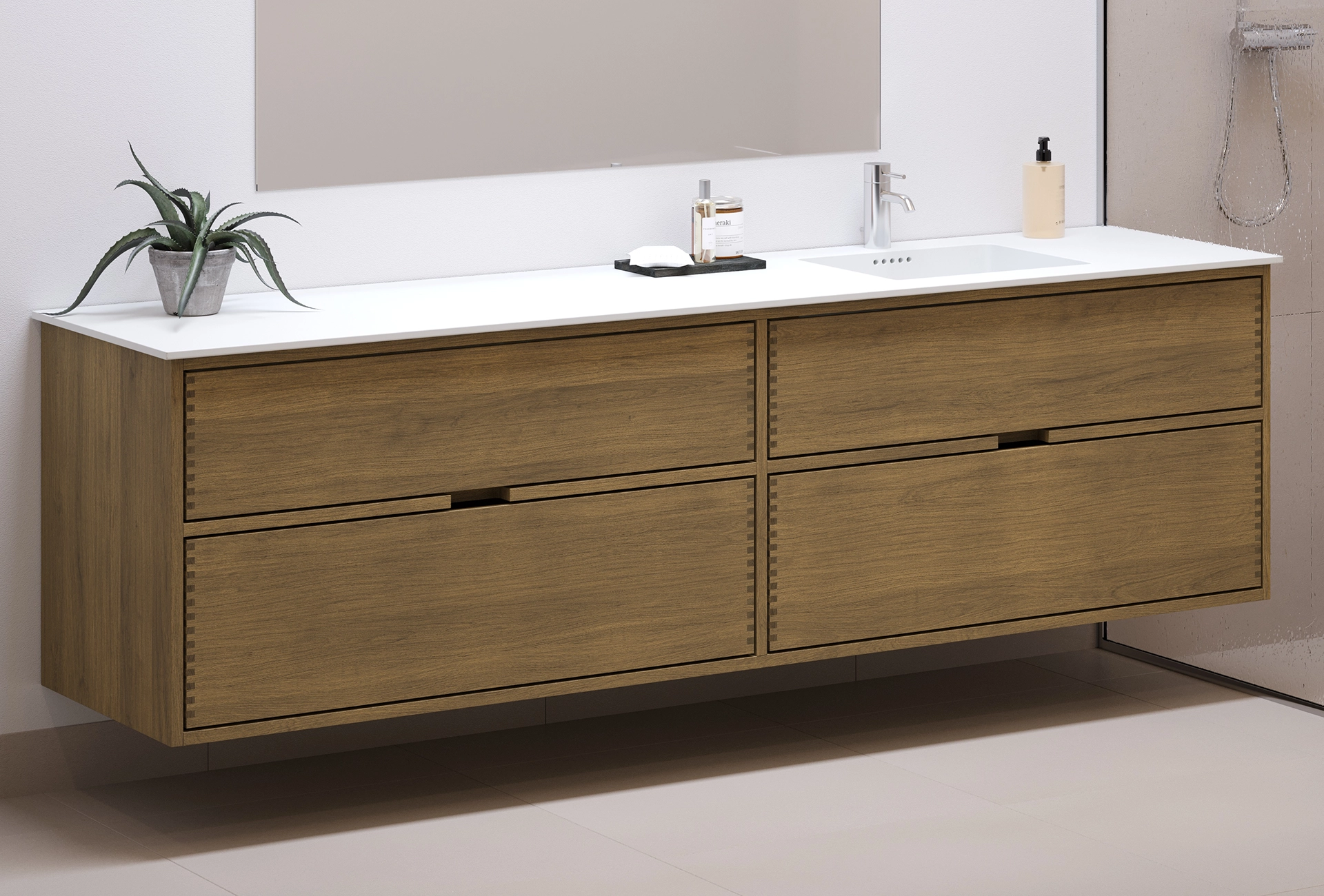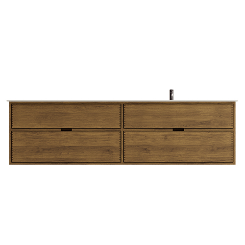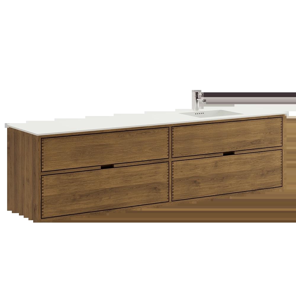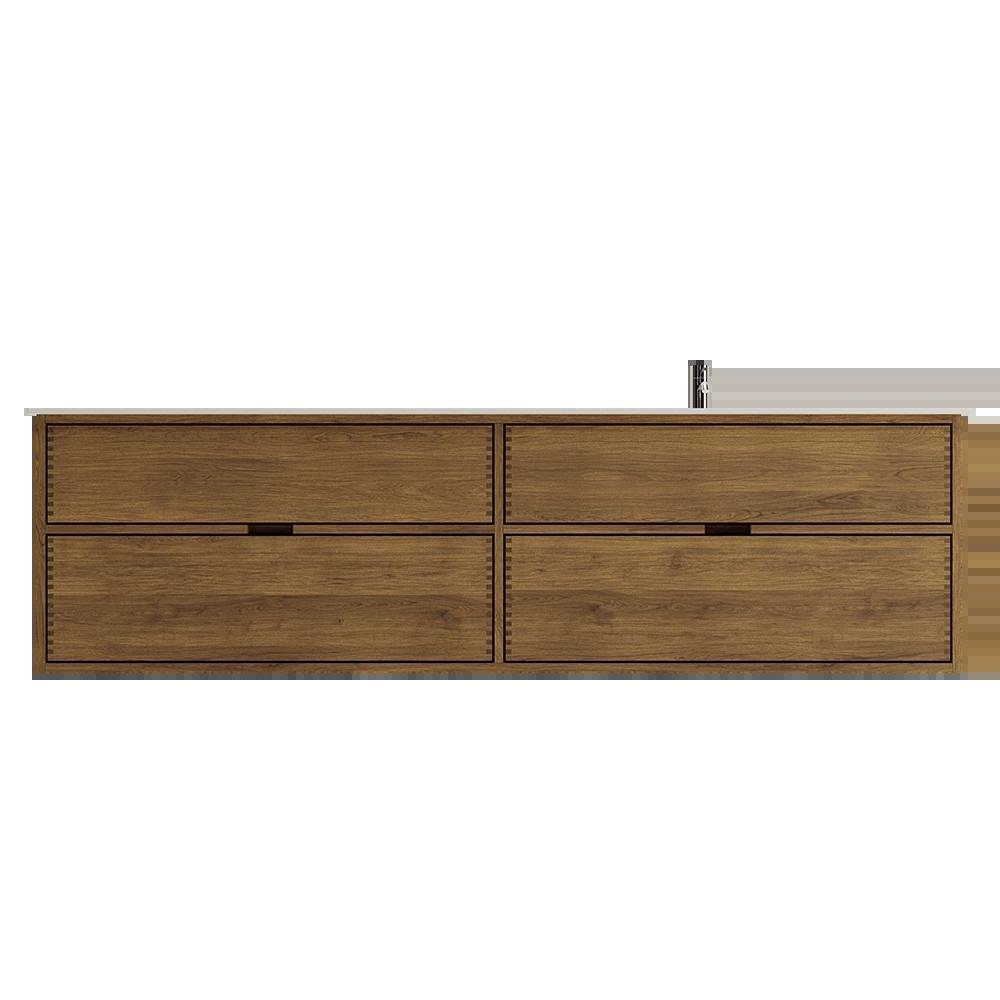 Deze meubel heeft 4 laden. De meubel is gemaakt met massieve, geoliede en vingergetapte eikenhouten laden met mooie details. De laden hebben volledige uittrek en softclose en hebben een wastafeluitsparing in de bovenste lade en volledige diepte in de onderste lade.