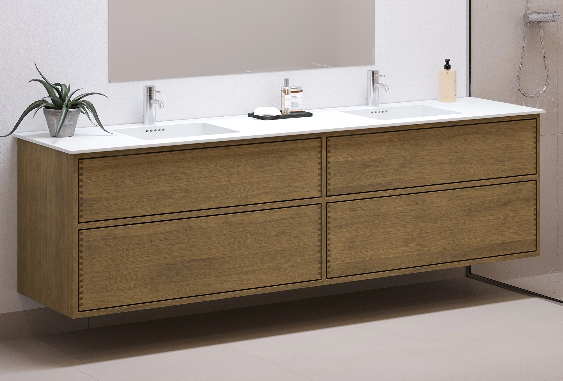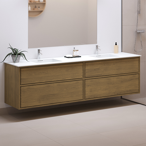 Dit meubel heeft 2 laden met push to open. Het meubel is gemaakt met massieve, geoliede en vingergetapte eikenhouten laden met mooie details. De laden zijn gemaakt met volledige uittrek en soft close en worden geleverd met een wastafeluitsparing in de bovenste lade en volledige diepte in de onderste lade.