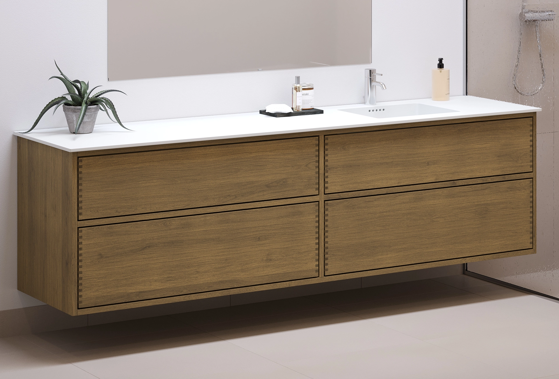 Dit snedker badmeubel heeft 2 laden met push to open. Het meubel is gemaakt met massieve, geoliede en vingergetapte houten laden van eikenhout met mooie details. De laden zijn gemaakt met volledige uittrek en softclose en worden geleverd met een wastafeluitsparing in de bovenste lade en volledige diepte in de onderste lade.