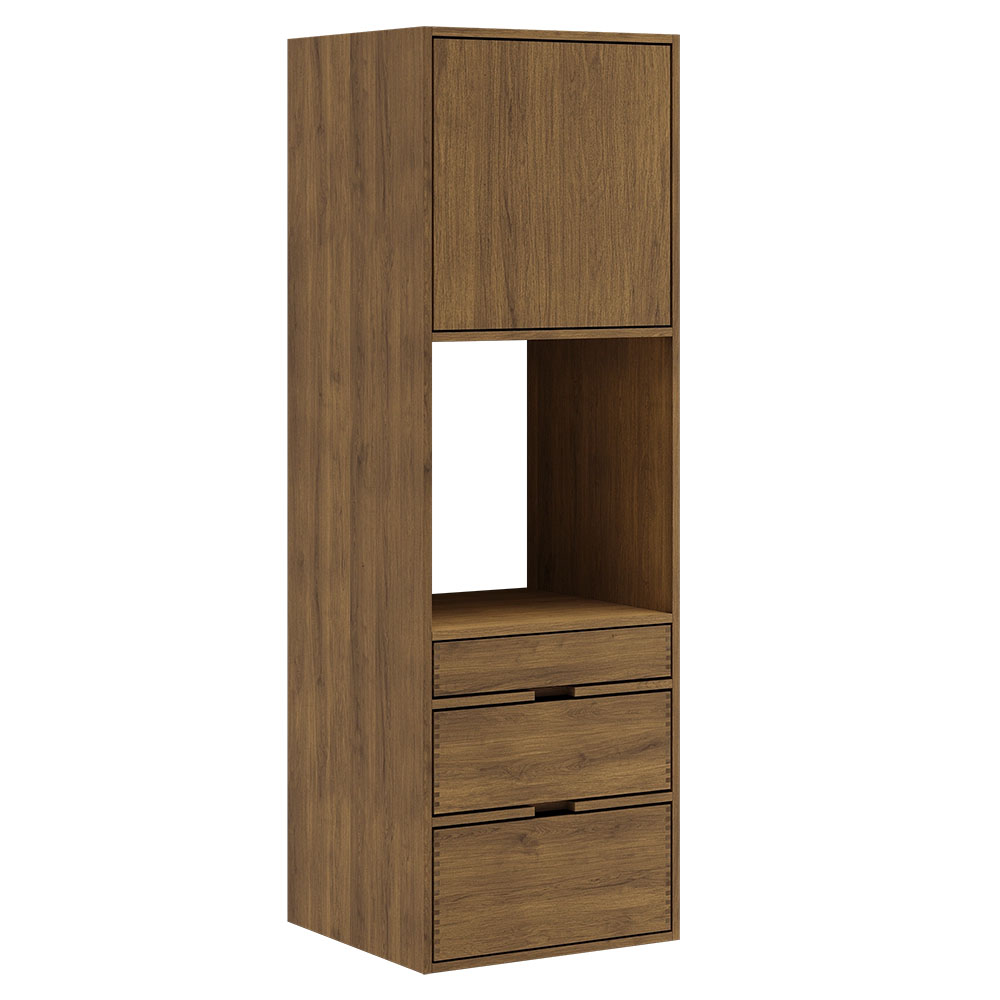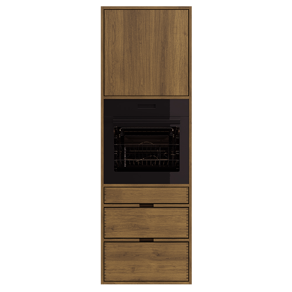 Onze Just Wood hoge kast voor oven is opgebouwd met drie lades onderaan, die overeenkomen met de rest van de Just Wood keukencollectie. Boven het ladedeel bevindt zich een ruimte voor het plaatsen van een standaard inbouwoven. Bovenin de kast bevinden zich twee gefineerde eikenhouten legplanken over de volledige diepte.